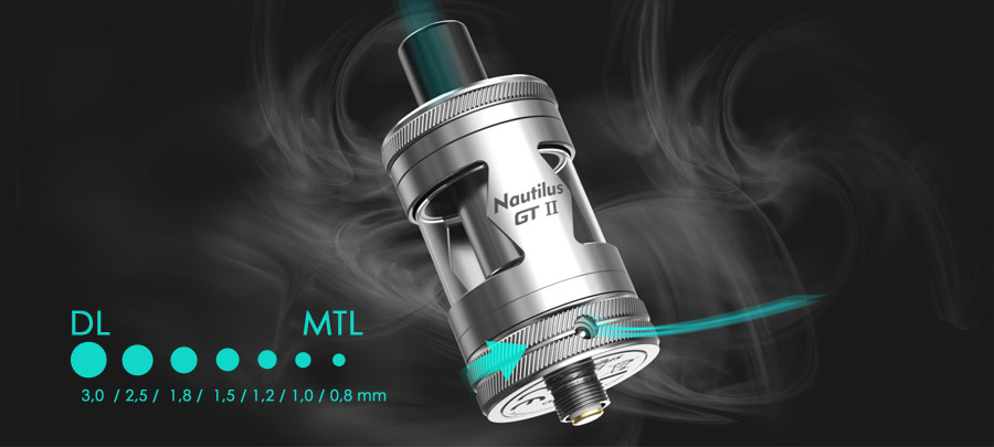 Tank Nautilus GT II ponúka prémiový zážitok z vapovania vďaka presne nastaviteľnému krúžku prúdenia vzduchu, ktorý umožňuje plnú kontrolu nad hustotou pary a prúdením vzduchu.