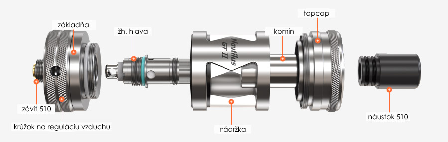 Atomizér Nautilus GT II je kompatibilný so všetkými špirálkami série Nautilus, vrátane starších BVC hláv. V krabičke Nautilus GT2 nájdeme dve hlavy – 1x Nautilus 2S Mesh Coil 0,3 Ω a 1x Nautilus BVC Coil 1,8 Ω.