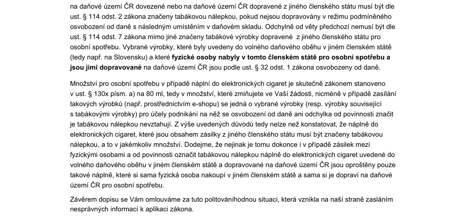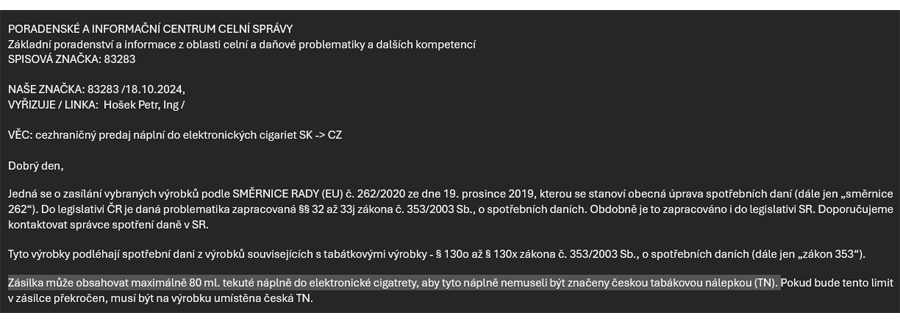 Ako môžete vidieť, 18. 10. 2024 sme dostali písomné potvrdenie od Generálního ředitelství cel, že pri objeme do 80 ml je ešte dovolené posielať e-liquid do ČR. Ubehlo pár týždňov a po lepšom preskúmaní platnej legislatívy sa napokon zistilo, že to NIE JE PRAVDA. Všetky tekuté náplne, ktoré sú obsahom zásielky z iného členského štátu (do ČR) musia byť označené tabakovým kolkom, a to v akomkoľvek množstve! Generální ředitelství cel sa nám ospravedlňuje za poľutovaniahodnú situáciu, ktorú spôsobil ich nesprávny výklad zákona.