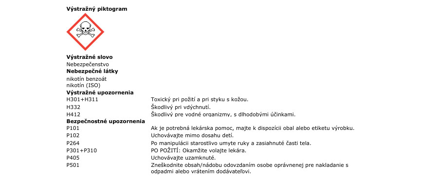 - nikotínová soľ (nikotín benzoát), nikotín (ISO)