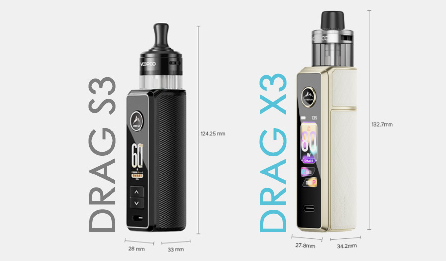 Univerzálny DRAG S3 POD MOD, s integrovanou 3000 mAh batériou, existuje aj v prevedení pre meniteľnú batériu typu 21700/18650. Rozmerovo väčšie zariadenie s označením DRAG X3 POD MOD disponuje veľkým, dotykovým displejom a 80 W výkonom. Hodí sa pre vysoko výkonný DL vaping s veľkou produkciou pary a pre všetkých, ktorí potrebujú dlhšiu výdrž a meniteľnú batériu.