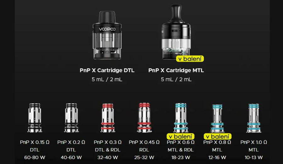 Obe pribalené PNP X hlavy sú určené pre MTL vapovanie, čiže ťahanie z úst do pľúc. Na výber sa ponúkajú aj iné odpory. Pre hlavy s nižšími odpormi odporúčame použiť DTL PNP X cartridge, ktorý je samostatne predajný.