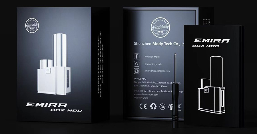 Spojenie nezameniteľného dizajnu a technológie Telli's MODu s vysoko kvalitnou a precíznou výrobou Ambition Mods viedol k vzniku EMIRA MOD. Zariadenie v prevedení SBS (Side by Side) je určené pre batériu typu 18650 a umožňuje regulovať výšku závitu 510 tak, aby vyhovoval rôznym atomizérom - s priemerom do 23 mm.