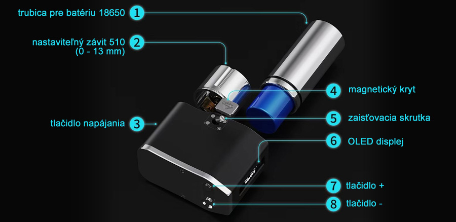 Lítium-iónový monočlánok typu 18650 je nutné si samostatne dokúpiť, keďže nie je súčasťou balenia. Nabíjací port by ste tak isto márne hľadali, EMIRA SBS MOD nepodporuje nabíjanie v MODe. Vyžaduje externú nabíjačku!
