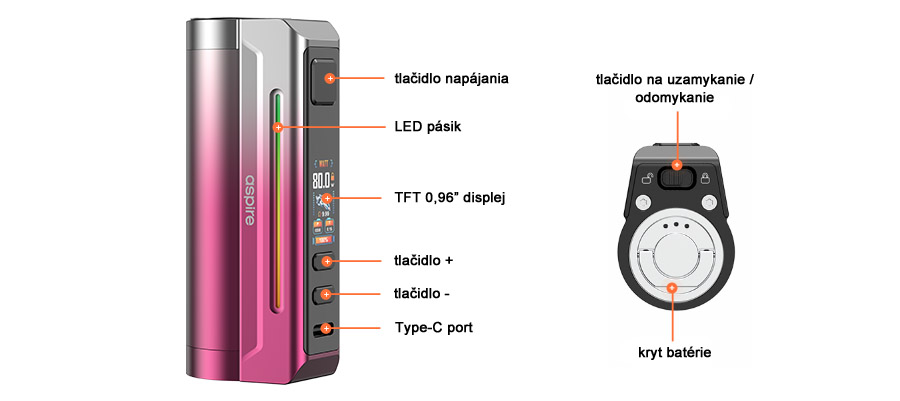 Najnovší model Zelos X80 MOD disponuje 0,96“ farebnou TFT obrazovkou, bočnými LED pásikmi a praktickým tlačidlom na uzamknutie zariadenia, aby sa predišlo nechcenému zahrievaniu. Je vybavený slotom pre batériu typu 18650 (samostatne predajná) a štandardným 510 závitom pre atomizéry s max. 26 mm priemerom.