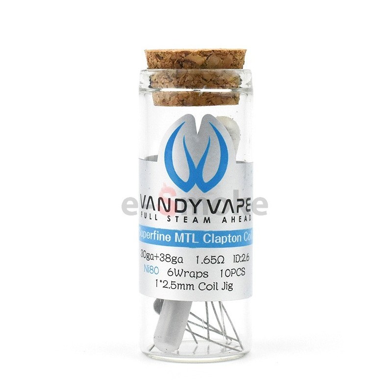 Vandy Vape Superfine MTL Clapton špirálky sú vyrobené z dvoch Ni80 drôtov s odlišným priemerom. Jedno jadro 30GA (0,25mm) je omotaní veľmi tenkým drôtom 38GA (0,1mm), výsledný odpor je 1,65 Ω.