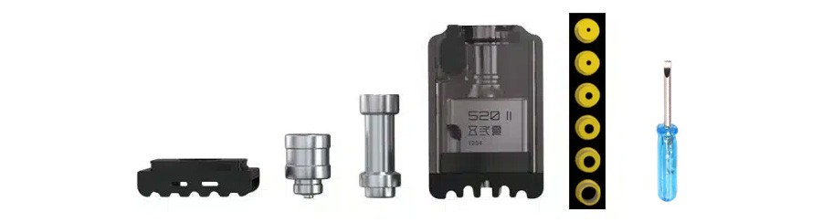 Menej pokročilí používatelia ocenia pribalený adaptér pre PNP-VM / GTX žhaviace hlavy. Sada 520 BORO Tank II obsahuje aj 510 adaptér na suché vypaľovanie špirálky a praktické náradie v podobe mini skrutkovača.